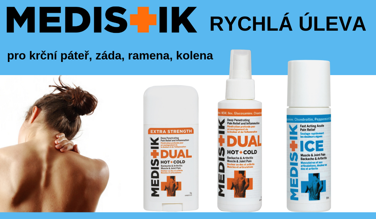 Stále častěji trpí ženy bolestí krční páteře a zad díky trvalému předklonu při práci. Kanadské masážní přípravky Medistik můžete ZDARMA vyzkoušet ve formě sticku, spreje a kuličky i když vás zrovna nic nebolí. Aplikují se bez kontaktu rukou na pokožku za účelem hloubkového prokrvení, uvolnění a regenerace unavených svalů a kloubů. Díky účinné receptuře a dvojitému efektu Hot + Cold rychle zabírají a skutečně pomáhají. Veletržní akce 3+1. |