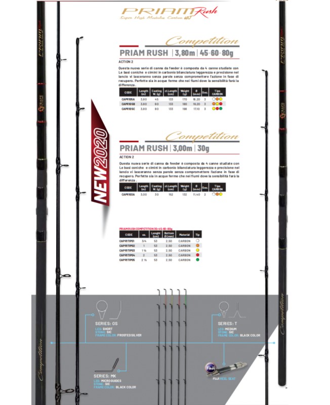 Série Priam Rush patří mezi největší esa z celé škály feederových prutů. V provedení délky 3.00m s vrhací zátěží 30g a s parabolickou akcí a citlivými špičkami, je tento prut opravdu jeden z nejlepších na trhu. Citlivé špičky perfektně ukazují i ty nejjemnější záběry. Díky těmto vlastnostem je tento prut vhodný jak pro závodní chytání, tak i pro zdolávání velkých ryb. Celková hmotnost prutu je až bezprecedentní a to 134g!!