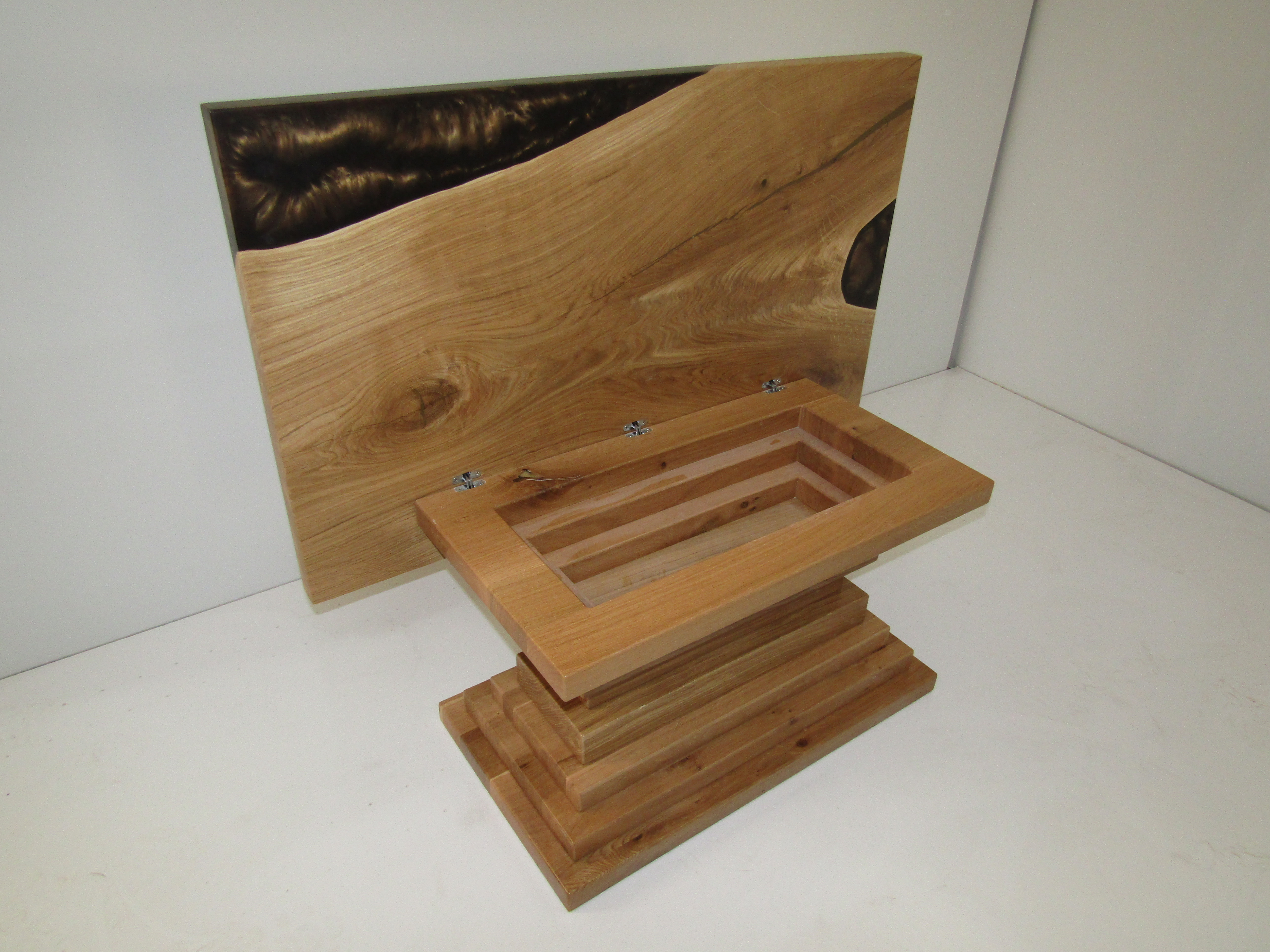 Konferenční stolek z dubu doplněný epoxidem s metalicou hnědou barvou. Noha má úložný prostor, po vyklopení horní desky se může využívat . Dodací lhůta 2 - 4 týdny.