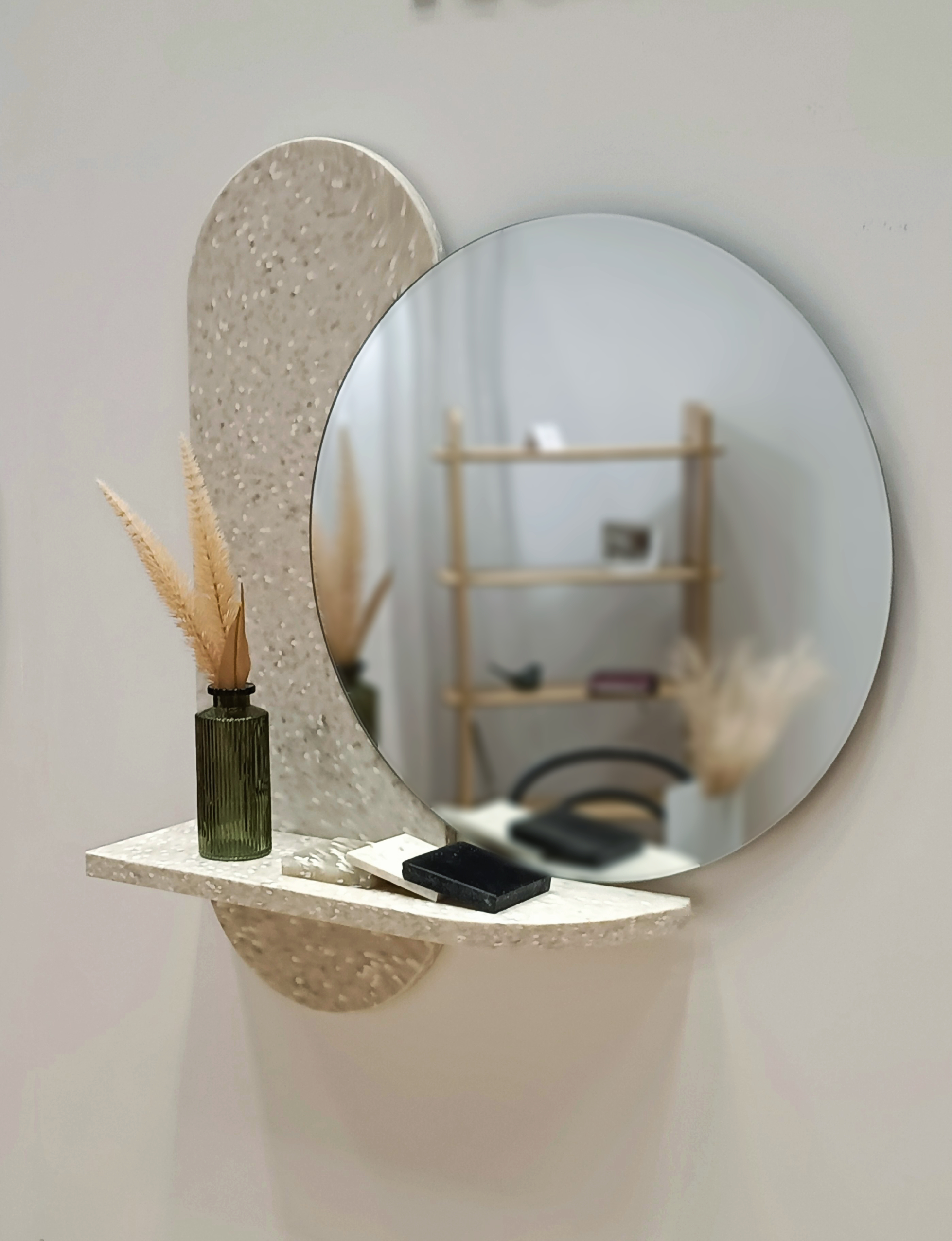 Nástěnné zrcadlo je originálním designovým doplňkem, jak do soukromých, tak veřejných interiérů. S praktickou poličkou na drobné předměty nebo doplněk bylo navrženo do předsíní jako místo, kde vždy najdete své klíče a peněženku. Zrcadlo je pro přepravu balené naplocho, kvůli lepší skladovatelnosti, poličku si zákazník připevní sám pomocí dvou konfirmátů (které jsou spolu s imbusem součástí balení) podle přiloženého návodu. Zrcadlo je k dispozici ve dvou velikostech 630x720mm, s průměrem zrcadla 50 cm a 770x880 mm s průměrem zrcadla 60 cm. Materiál je recyklovaný plast od brněnské firmy Plastic guys. Cena za menší verzi: 8.500 Kč.