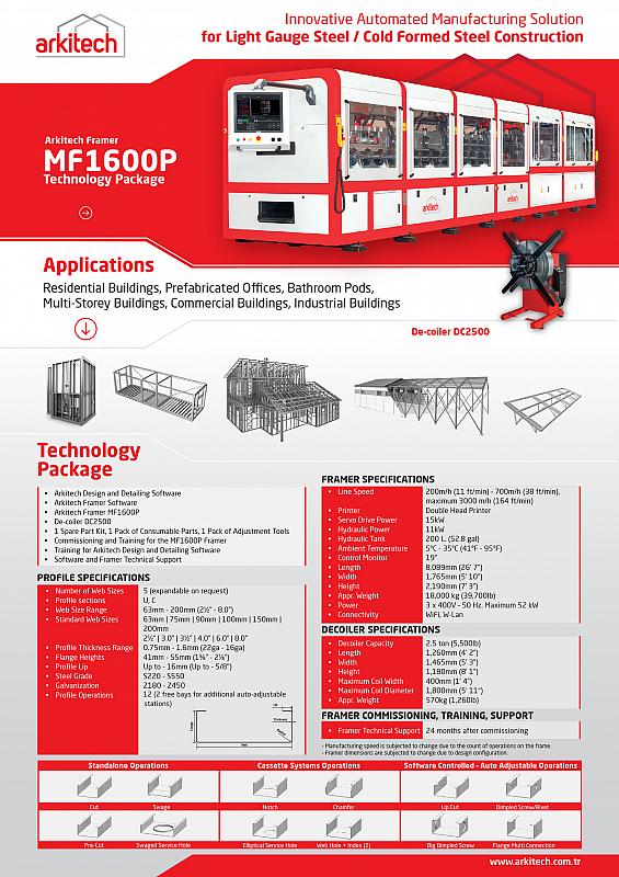 The MF1600P is a high-performance LGS production line with 14 hydraulic bays and 12 tool stations. In standard configuration it supports 5 profil web sizes and can be expanded on request. Built for heavy-duty use, it ensures precision, efficiency, and proven reliability. Automatic profile web size adjustment is managed via software-controlled servo drive, making it a versatile and cost-effective solution.