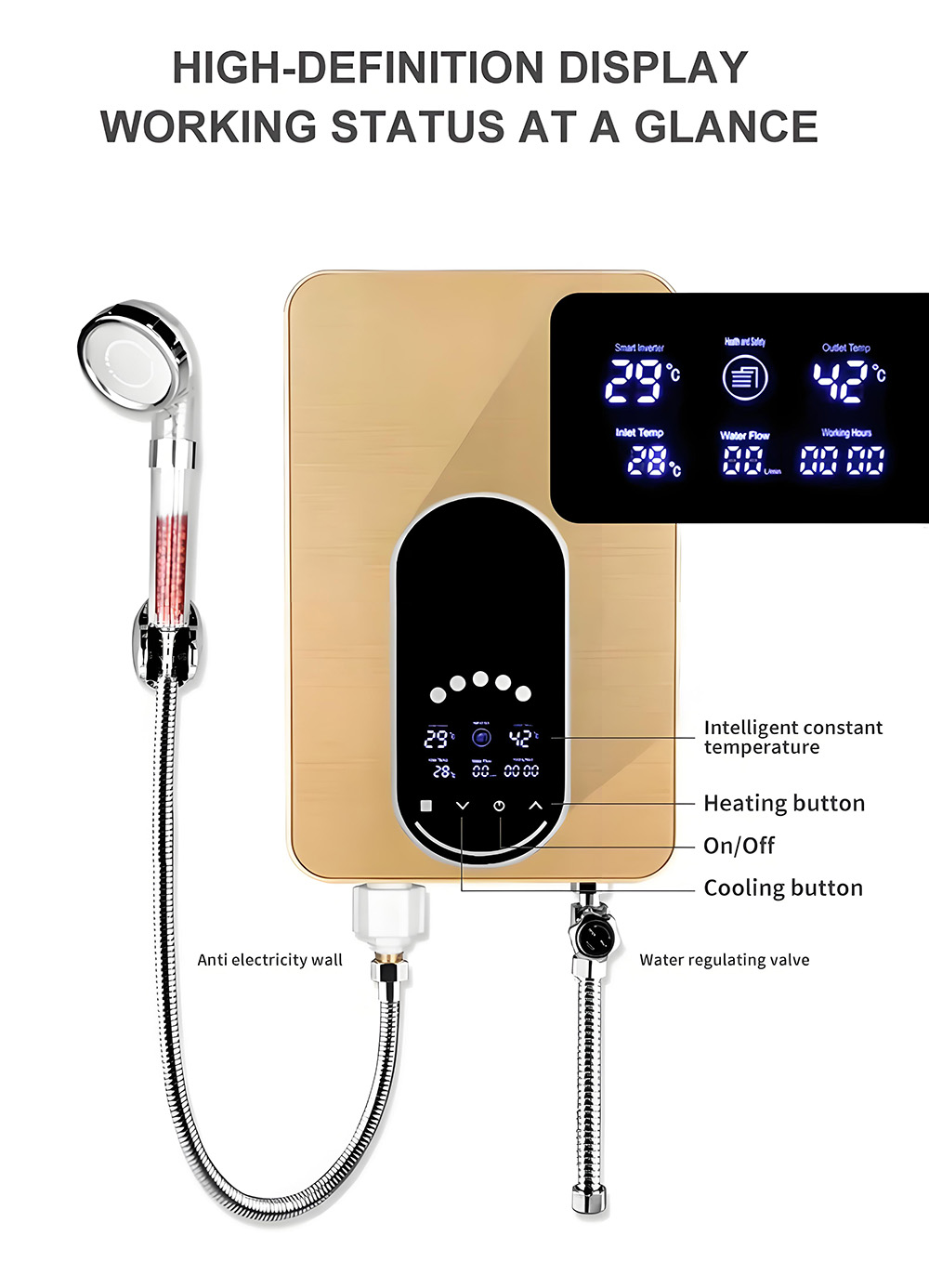 Chytrý digitální elektrický ohřívač vody pro koupelnu se správnou cenou, jednootvorová elektrická baterie s digitálním displejem pro koupelnové umyvadlo nebo kuchyňský dřez pro sprchu.