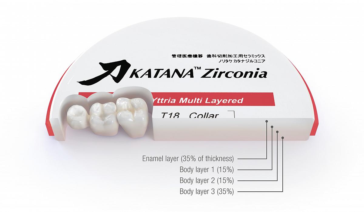 Díky silnému tělu a vysoce průsvitné vrstvě skloviny nabízí výrobek KATANA™ Zirconia YML vlastnosti potřebné pro široké spektrum indikací. Je založen na nové vícevrstvé technologii obsahující nově vyvinuté zirkonové suroviny s různou koncentrací yttria integrované do čtyřvrstvé barevné struktury. Výsledkem je odstupňování chromatičnosti, průsvitnosti a pevnosti v ohybu s dokonalou strukturou, která umožňuje zhotovovat vysoce kvalitní, realistické náhrady - včetně monolitických můstků s velkým rozpětím.
