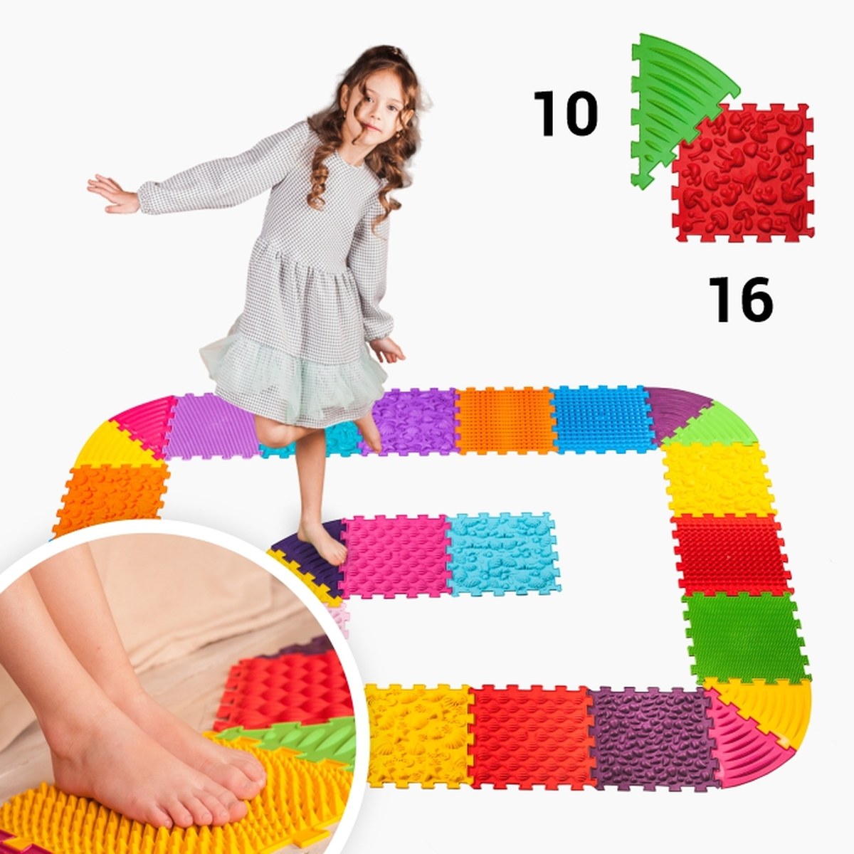 Rozšířený set pro intenzivnější stimulaci a větší plochu cvičení. Podporuje rozvoj klenby a správné návyky stoje/chůze u dětí, lze skládat do různých tvarů. Odolný materiál, jednoduchá údržba.