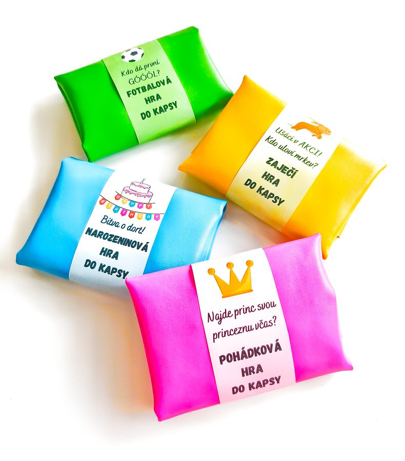Malinké na pohled, přesto plnohodnotné stolní hry, které zabaví na výletech i doma. Vyberte si z pestré kolekce - každá hra má svou barvu a příběh: (např: Najde princ svou princeznu včas?, Kdo dá první GÓÓÓL?, Bitva o dort ...) Krásné balení her láká malé i velké. Jsou ideální na cesty, do čekárny nebo jako dárek, či reklamní předmět.