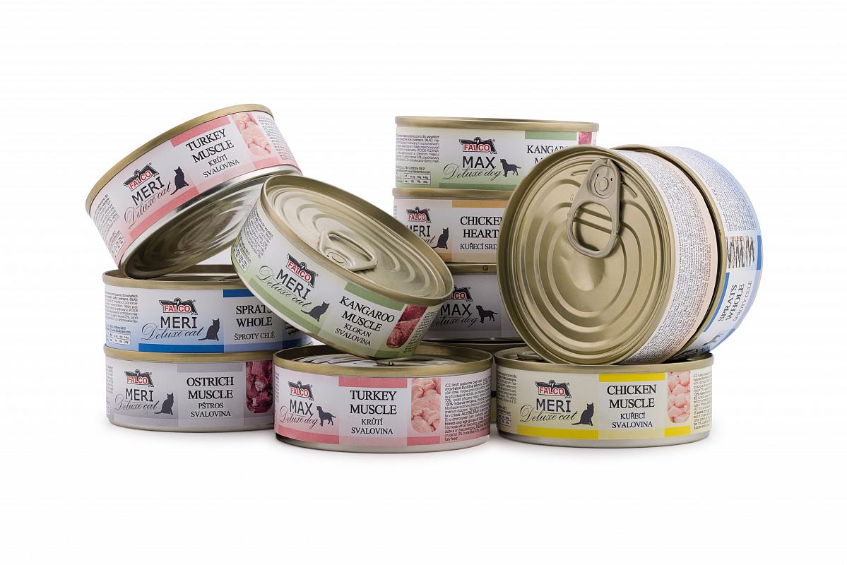 We present 80 g cans MAX and MERI made of pure muscle meat. Your pets can choose from six types of meat: four proven classics as well as two new exotic varieties – ostrich and kangaroo muscle meat. Thanks to their practical size, these cans are an ideal portion for travel or as a small treat. If you have small dogs or cats at home, these cans are a suitable choice for them. They are 100% natural, without colorants, flavorings, preservatives, or grains.