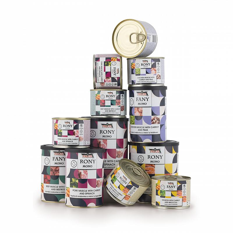 The power of a single muscle meat. The right amount of vegetables. These are RONY MONO and FANY MONO – a new product of this year. They contain 90% muscle meat from a single animal species, including heart for additional nutrients, and 10% vegetables to support digestion and provide antioxidants. They support muscles and vitality, a healthy heart, immunity, and vision – exactly what your pet needs every day. They are 100% natural.
